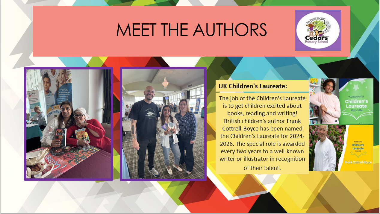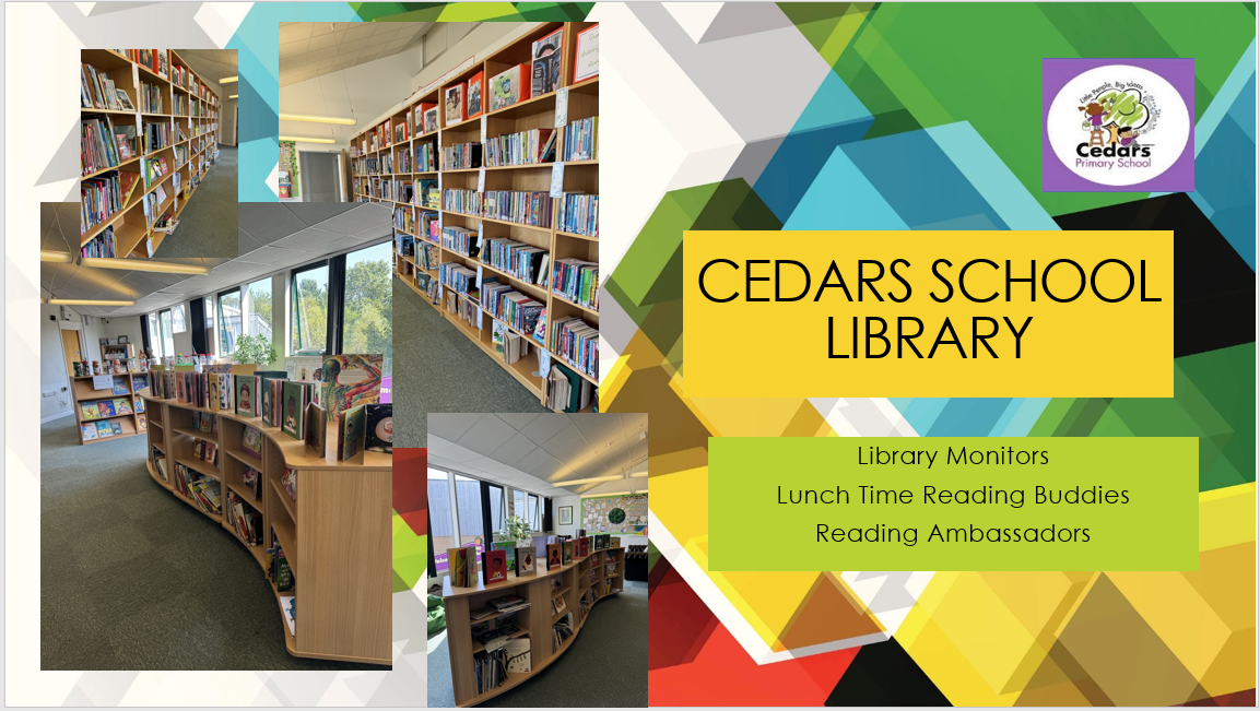 Reading for pleasure is given a high priority at Cedars. We hold an annual Super Reading Week to celebrate World Book Day in March, during which our children have access to a variety of reading experiences, including visits from local authors & visits to Blackburn Central Library. Reading Buddy sessions take place on a half-termly basis and children enjoy sharing stories with children from a different class. We have a fantastic school library which is open at lunchtimes and children enjoy and share. We also celebrate ‘Author of the Month’ and have lots of competitions for the children to take part in.