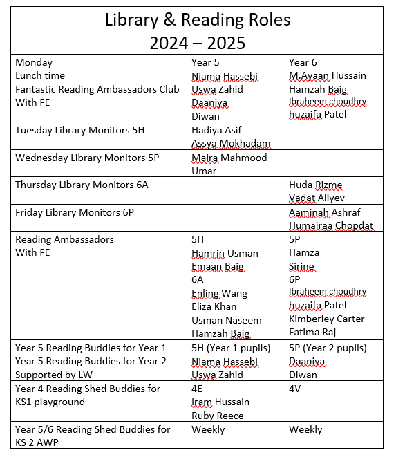 As part of our Reading Curriculum all Year groups visit the local Library and EYFS will arrange a visit from the Library services to come and share stories.